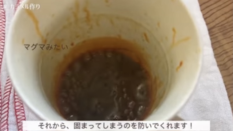1.砂糖と水を耐熱マグカップに入れ、600wのレンジで、2分チンしてカラメルを作る。(500wの場合 : 2分30秒)
