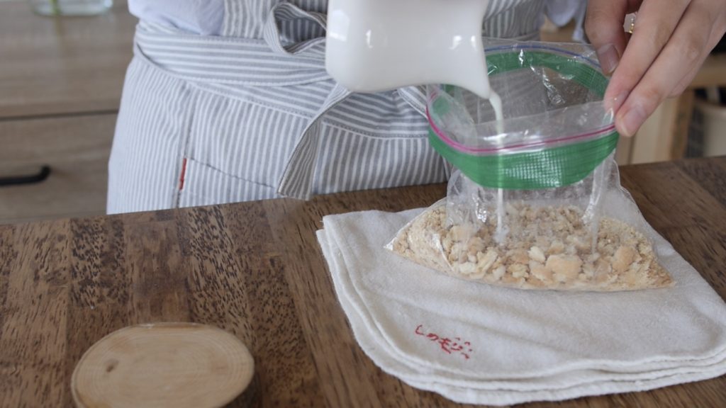 1.ビスケットを袋に入れ、棒などで叩き細かくする。