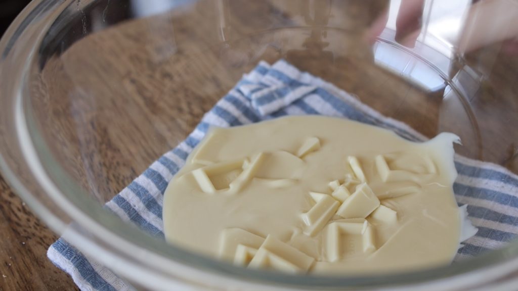 4.ホワイトチョコを細かくして、耐熱容器に入れ、600wのレンジで1分程度チンする(500wの場合は1分半程度)