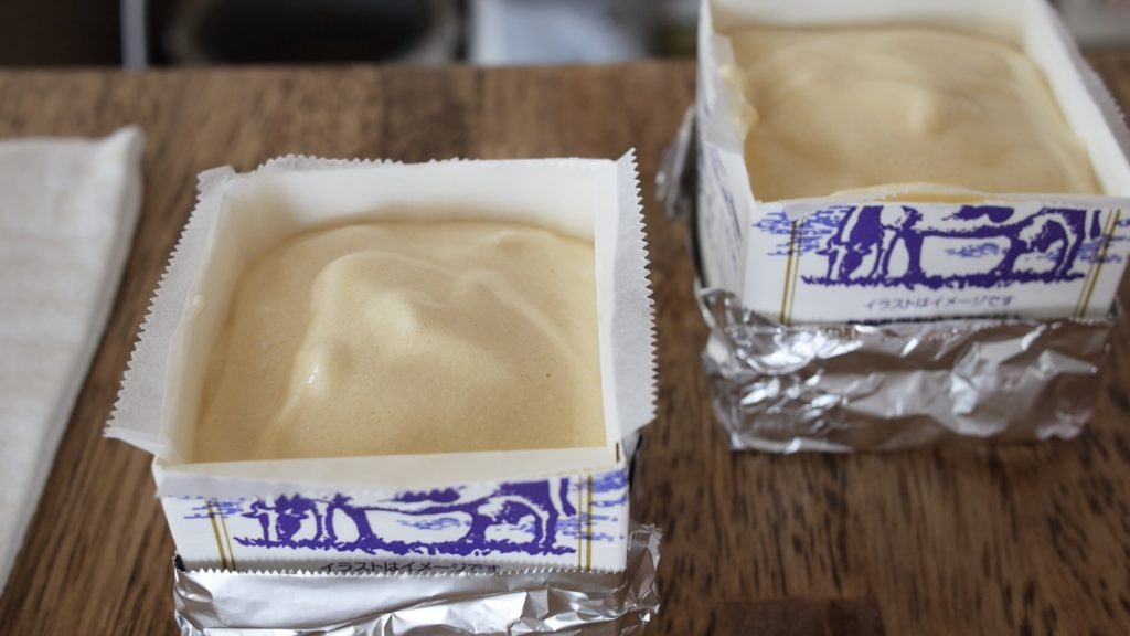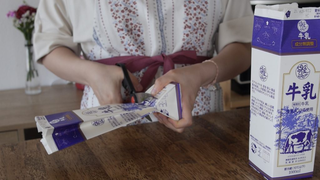 牛乳パックを軽く潰して、大体6〜7cmくらいの高さで切る。