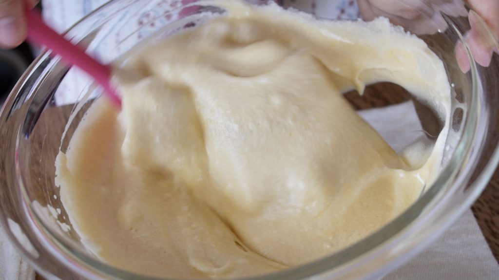 1,2回目はホイッパーで、生地を下から上に持ち上げつつ、ホイッパーの間を通す様に泡を潰さないように。(メレンゲ作りで使った電動ホイッパーを使ってOKです!)