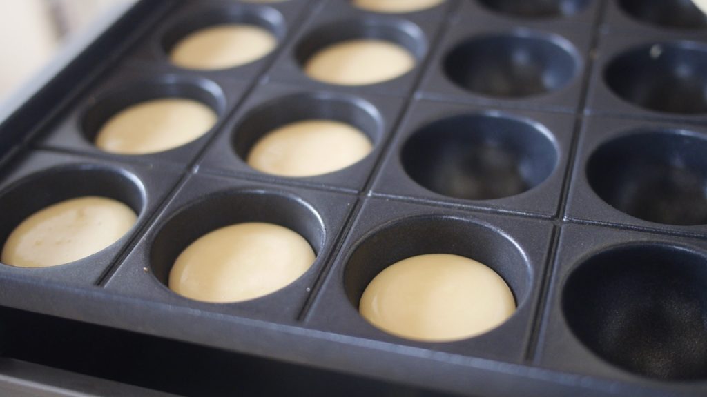 4.温めておいたたこ焼き器に生地を半分くらいまで入れる