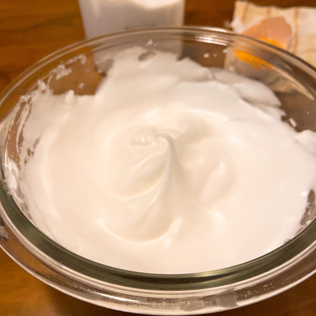 1.卵白を少し泡だてて、砂糖を数回に分けて加え、メレンゲを作る。