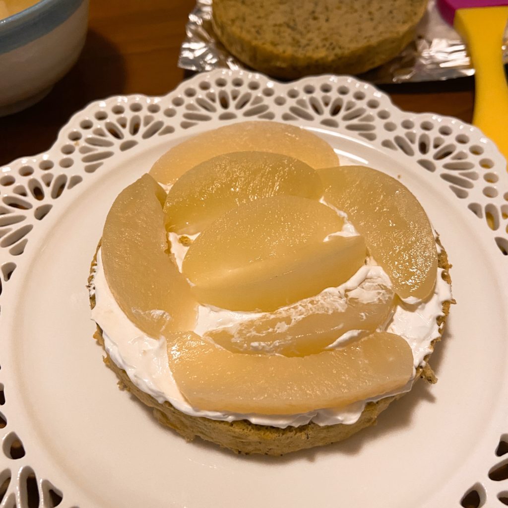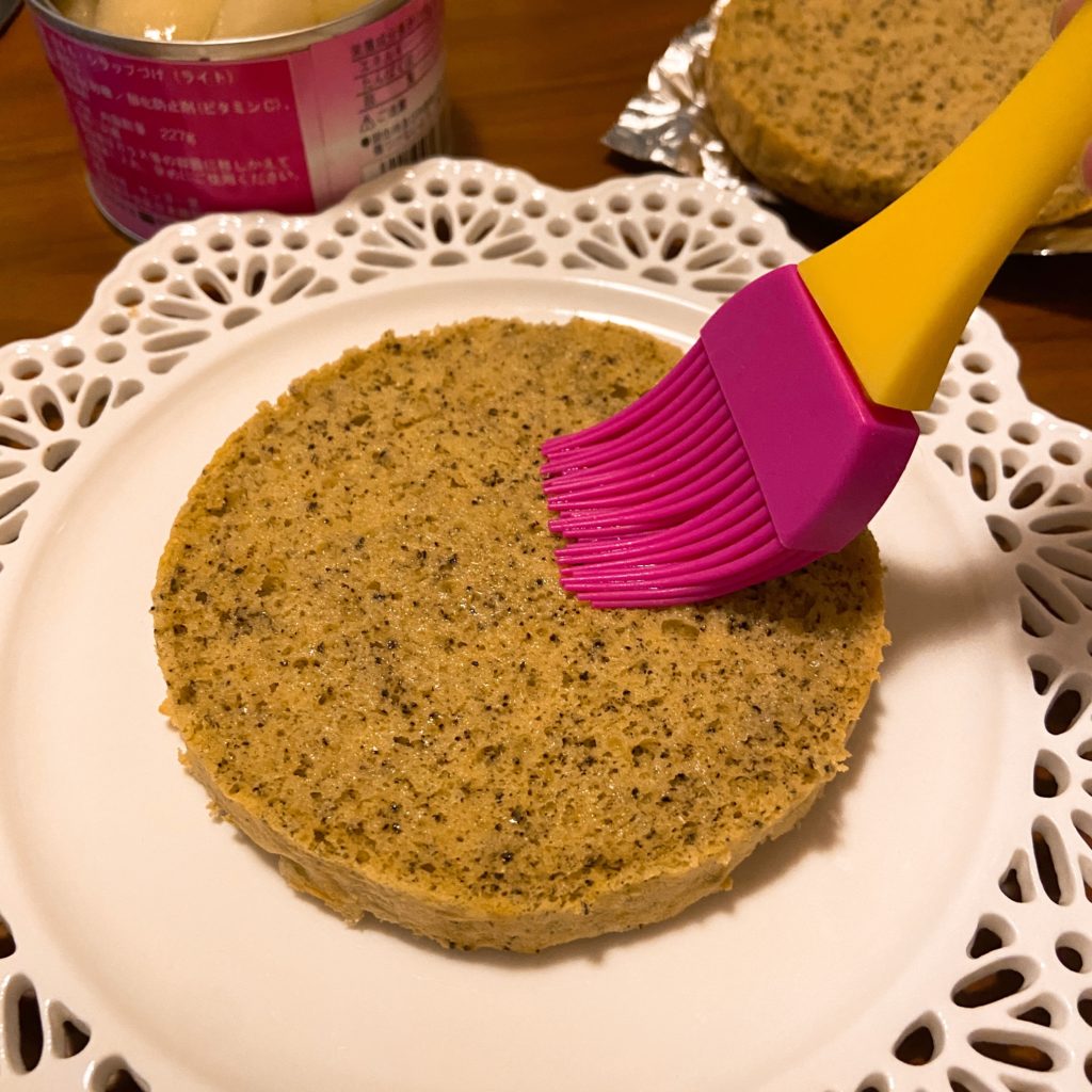 スポンジ→シロップ→生クリーム→桃→生クリーム→スポンジ→シロップの順で重ね、表面を生クリームでコーティングする(カナッペ)