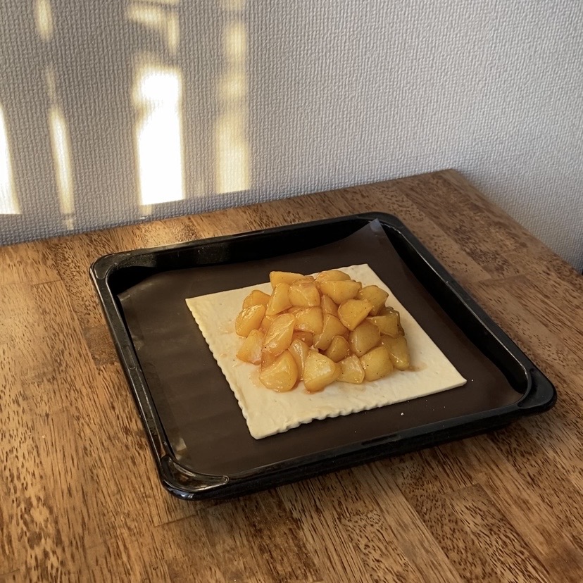 5.半解凍したパイシートにビスケットを砕いてのせ(なくてもOK)、冷ましたりんごの甘煮をドーム状にのせる。