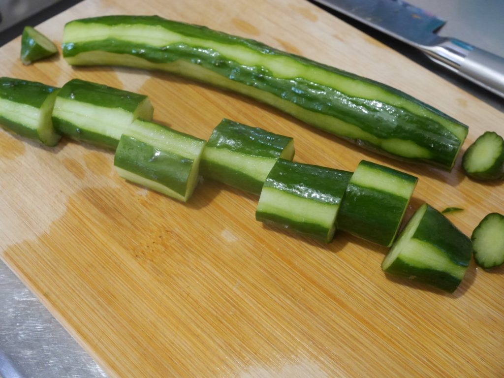 きゅうりはヘタを切り落とし、ピーラーで縞目状になるように皮をむき、3cmほどの大きさに切ります。