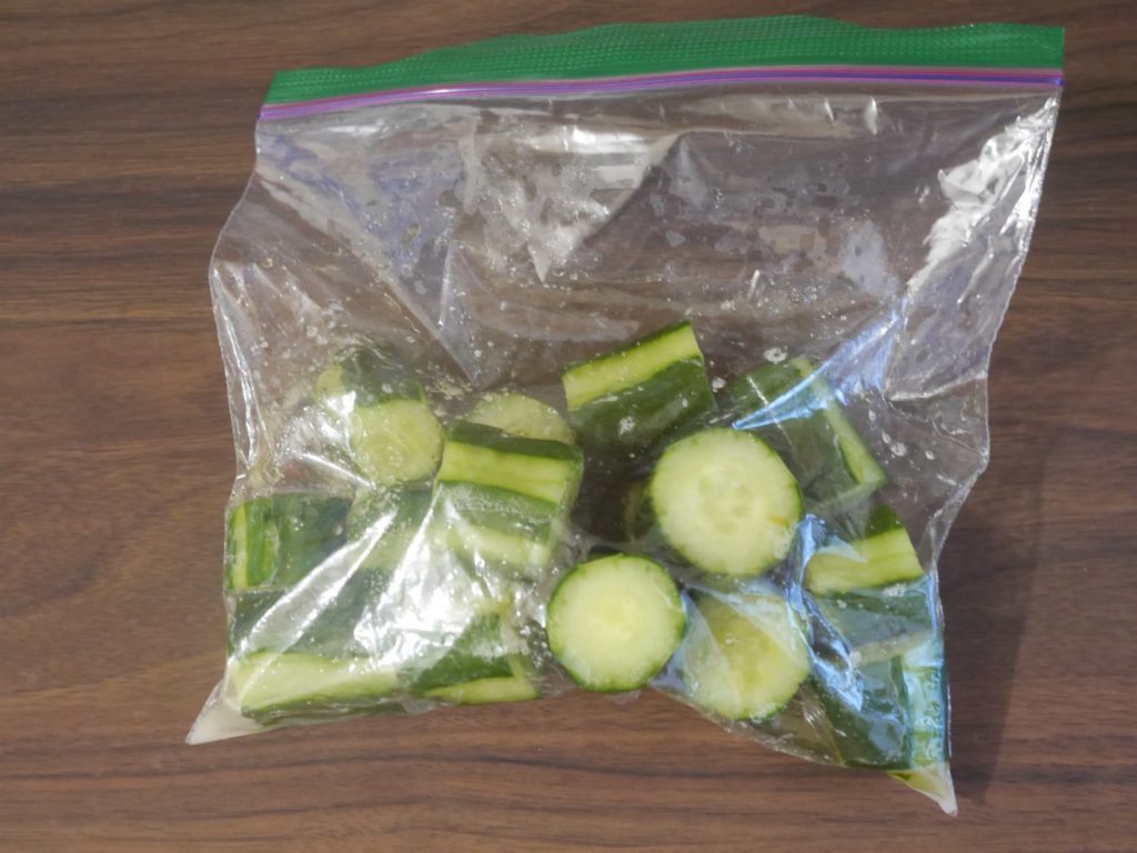 ポリ袋に、1のきゅうりと(A)を入れ、袋の上から軽く手でもみます。